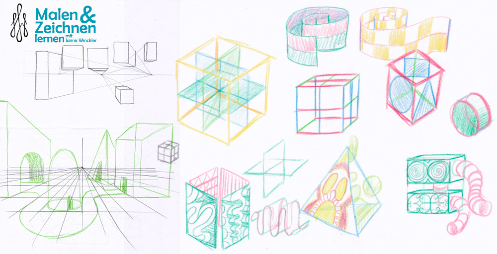 Lerne dann, wie du diese Formen in einer Welt mit Horizontlinie und bis zu drei Fluchtpunkten nach deinen Wünschen platzieren und bewegen kannst.