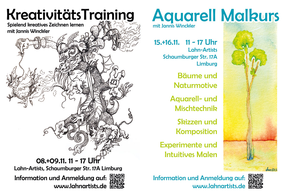 Ab April bis Oktober ist mein Atelier im Kalkwer in Limburg geöffnet. Nach Absprache gebe ich dort Mal- und Zeichenunterricht in kleinen Gruppen oder Einzeln.